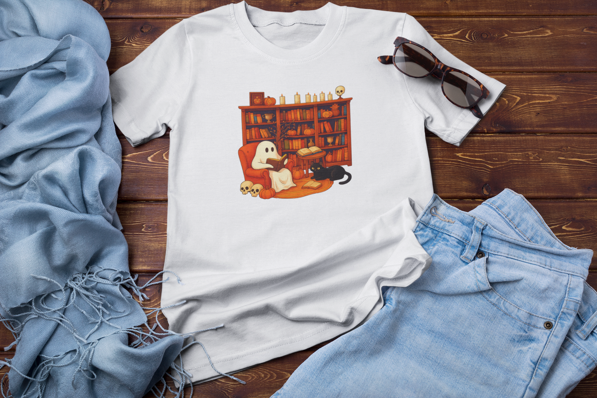 This Cozy Ghost Library Tee is perfect for book lovers, Halloween enthusiasts, and anyone who adores a little eerie charm. Featuring a ghost reading in a cozy armchair, surrounded by pumpkins, candles, and a watchful black cat, this design brings a warm autumn vibe that’s equal parts spooky and cute.