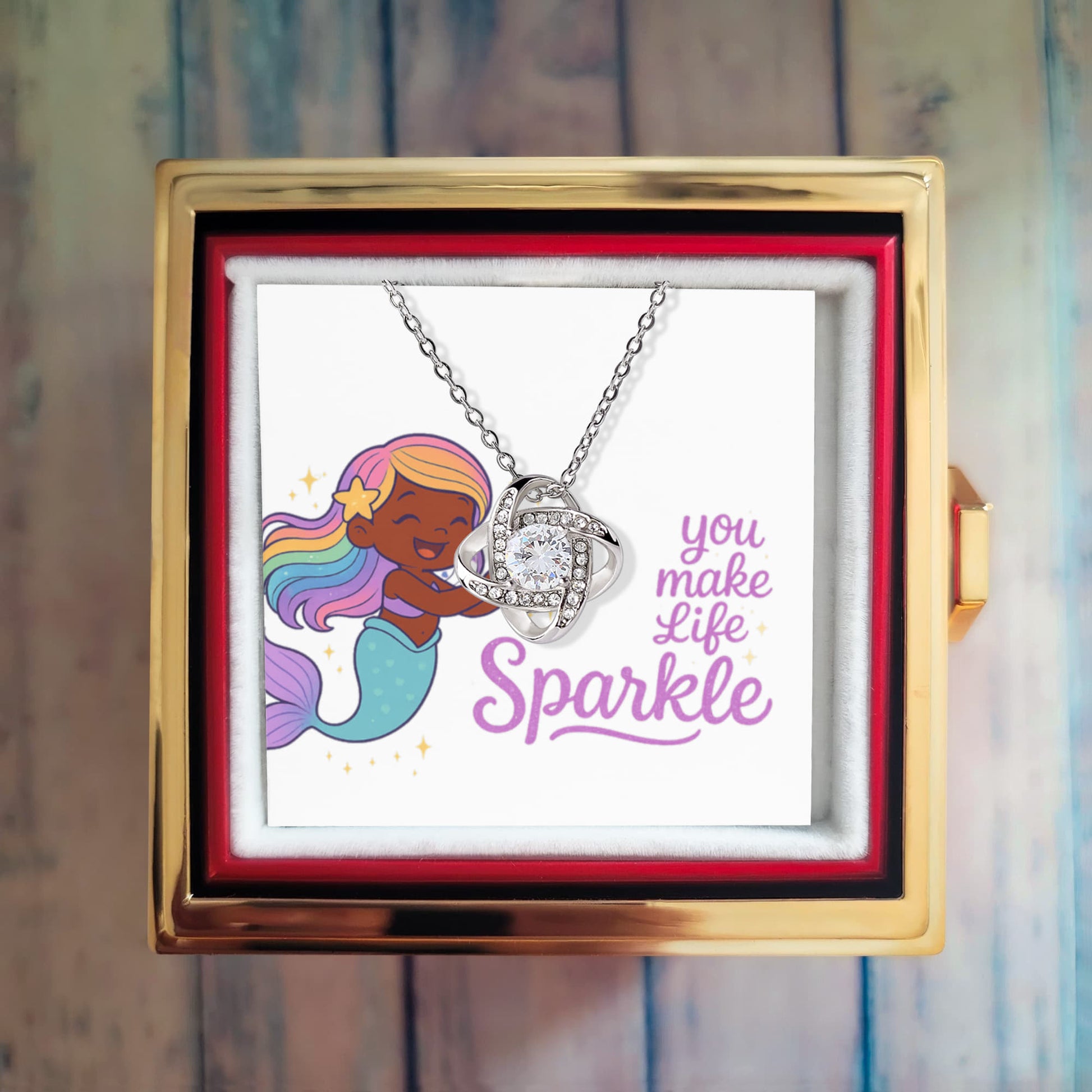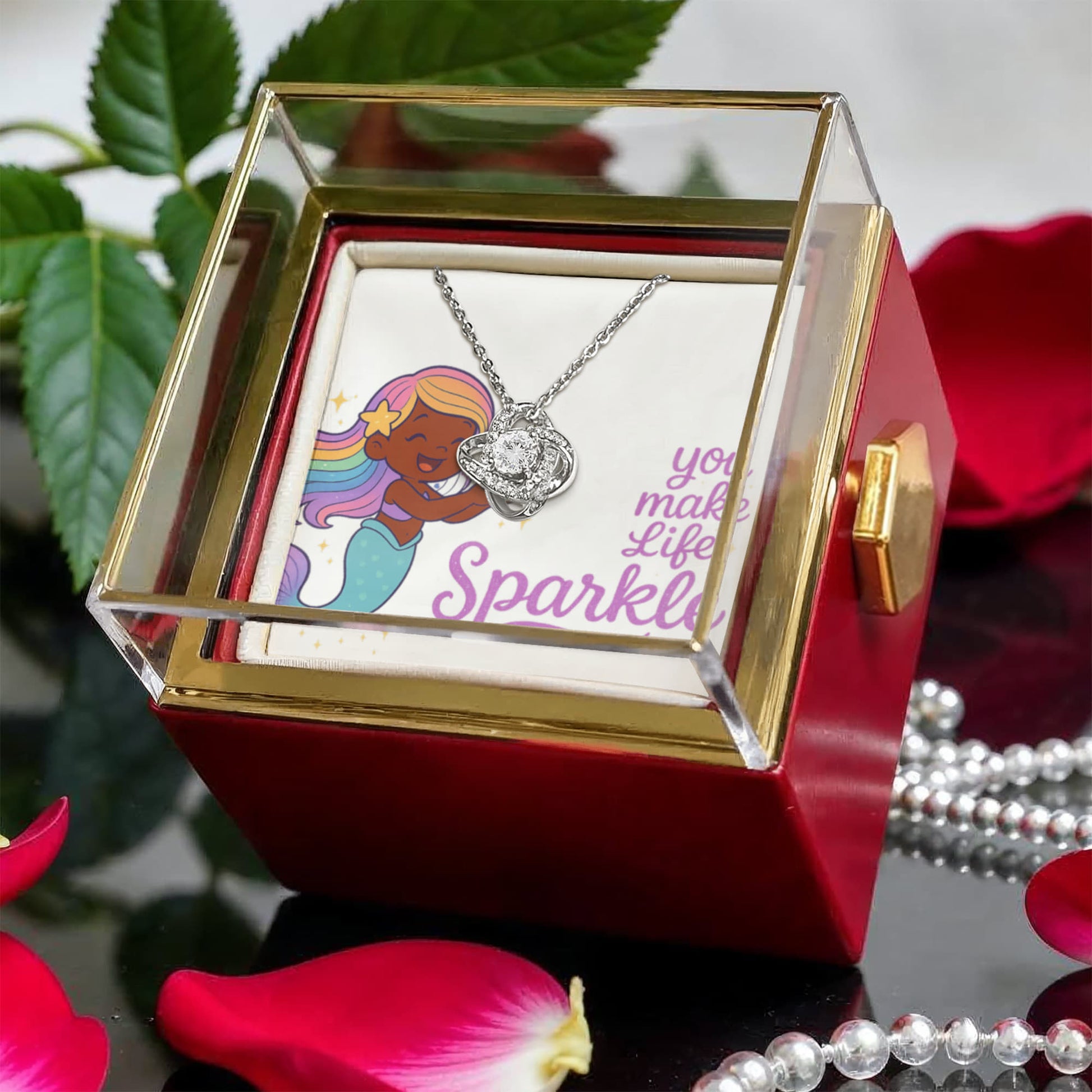 Imagine her reaction as she receives this beautiful Love Knot Necklace. Representing an unbreakable bond between two souls, this stunning pendant is adorned with premium cubic zirconia crystals, making it a timeless symbol of love and devotion. The luxurious box, featuring a meticulously preserved rose that never fades, adds an extra touch of love. With a simple turn of the gold knob, her breathtaking gift is revealed—making it the perfect sentimental gift for that special someone.